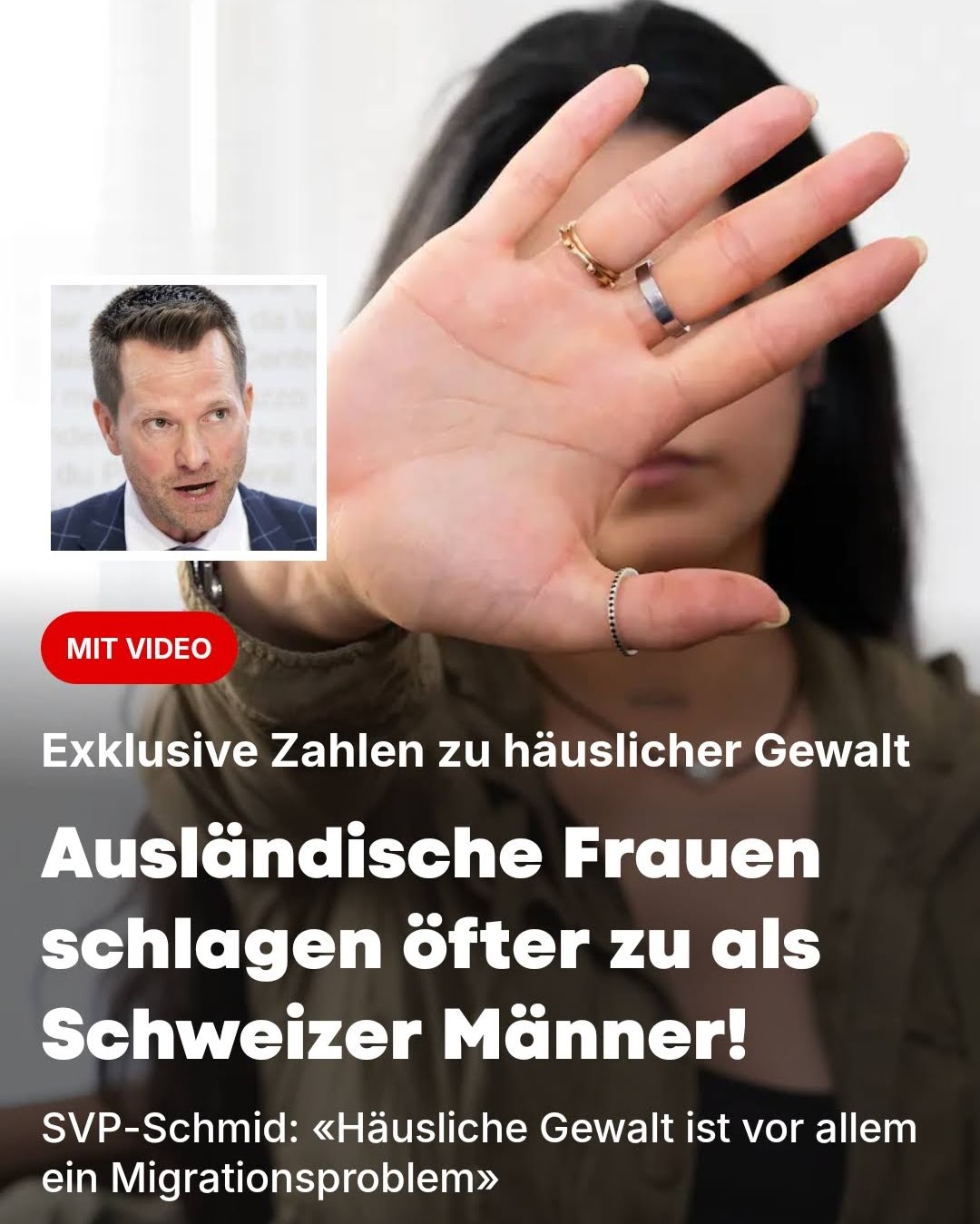 Häusliche Gewalt: Ausländische Frauen schlagen häufiger zu als Schweizer Männer 7. Februar 2026 Pascal Schmid Politik, Über mich 0 0 Blick, 6. Februar 2026 Beitrag PDF1 / Beitrag PDF2 https://www.blick.ch/politik/zahlen-zu-haeuslicher-gewalt-auslaendische-frauen-schlagen-haeufiger-zu-als-schweizer-maenner-id21666277.html https://www.blick.ch/community/leser-zu-haeuslicher-gewalt-neben-neuen-frauenhaeusern-braucht-es-mehr-abschiebungen-id21668025.html